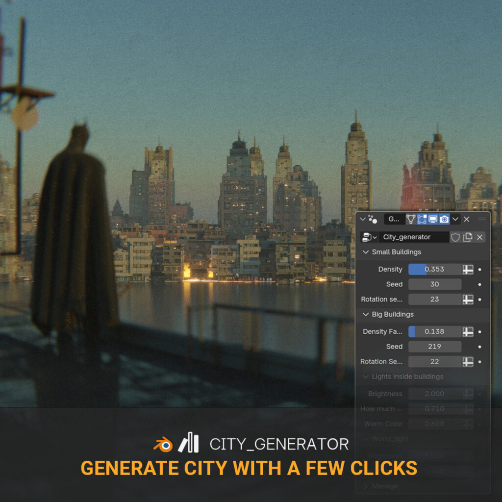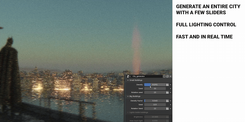 With just 11 sliders, you can control and change the look of the entire city – from the density of small buildings, large buildings, seeds, rotation seeds to the lighting inside the buildings and even the lighting of the entire city.